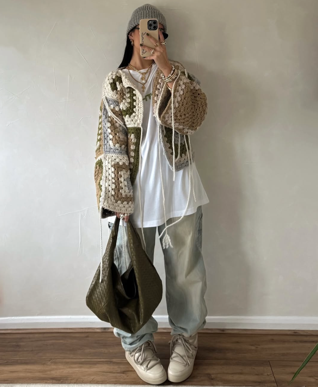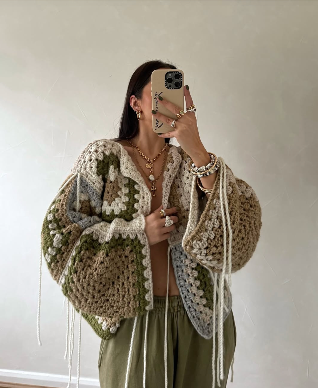 Handmade crocheted cardigan, crafted with recycled cotton and wool yarns in cream, green, gray, and brown. The design combines the retro style of squares with a modern, loose fit. The wide sleeves and braided drawstring closure highlight the comfort and authenticity of the piece. Ideal for cold days, it's versatile enough to create both urban and boho looks.
